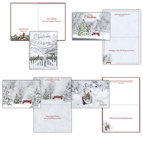 12 Cards - 4.72” x 6.5” • 3 each of 4 designs. Each card decorated on the inside • Versed with KJV Scripture. • Red Foil • Nancy Fullenwider