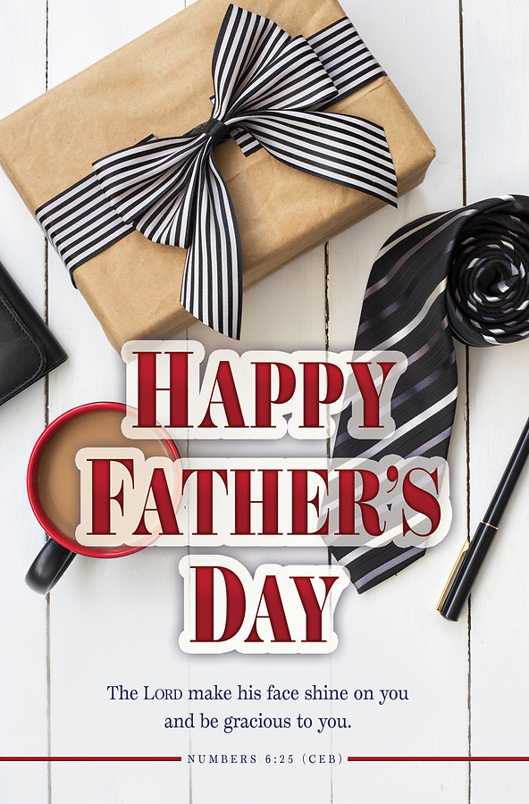 Celebrate Father's Day with this beautifully designed church bulletin featuring a sophisticated gift presentation and meaningful Scripture. The elegant backdrop of classic ties and wrapped presents sets the perfect tone for honoring the fathers in your congregation.