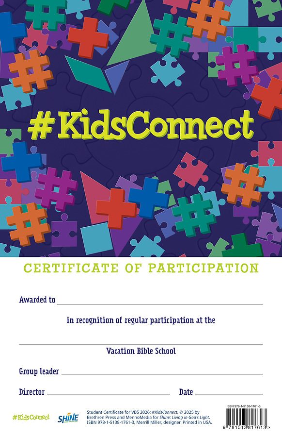 The #KidsConnect Student Participation Certificates celebrate children's attendance at VBS. Each pack comes with 20 certificates.